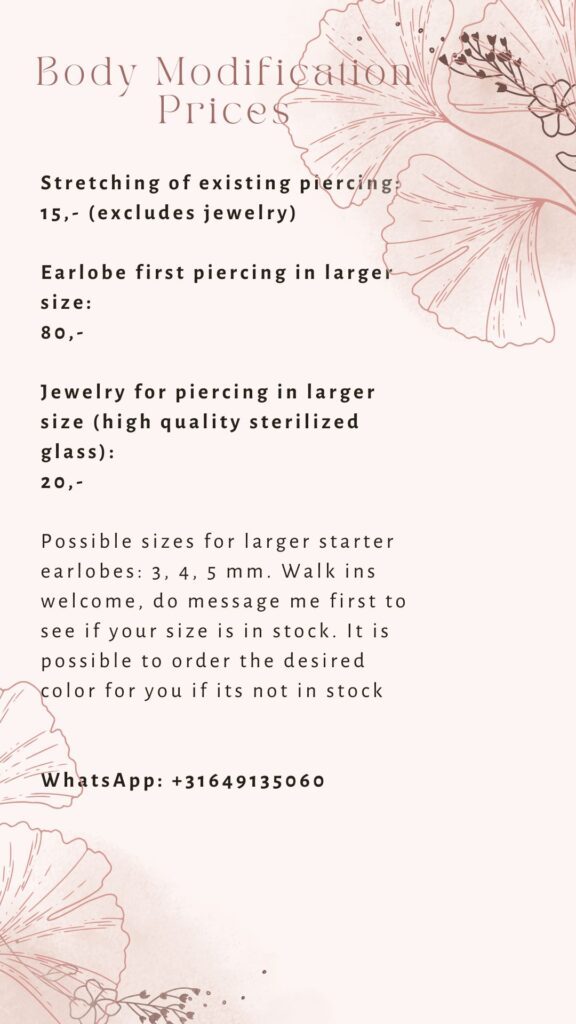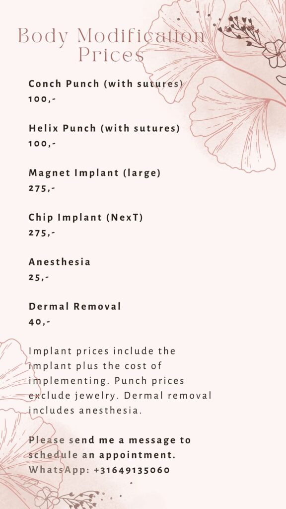 On my Instagram you can find much more information, including about aftercare, and more portfolio. My goal is to use high quality procedures and jewelry to bring out the best in you. I understand that getting pierced or modified can bring questions or nerves, so please feel free to contact me. I speak English and Dutch very well so you can contact me in any of those languages.